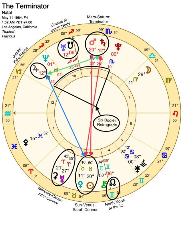 Both Mars and Saturn are opposing the Sun and Venus. The Sun is ruling the 7th house of “others” and “open enemies”. So if the ascendant represents the terminator robot, then the 7th house represents the “enemy” that the terminator must kill, Sarah Connor. Venus’ conjunction with the Sun confirms that this enemy is a female. Mars’ exact opposition to the Sun is striking as it emphasizes the intensity and focus of the conflict.[4] The terminator must kill Sarah Connor.