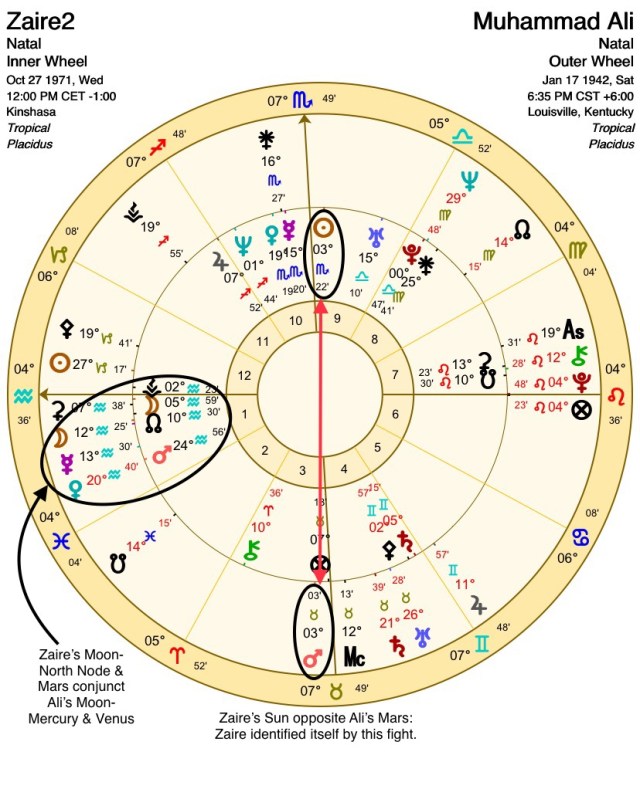 - Zaire2 Sun opposite Ali Mars: Normally, this contact may be challenging as it inspires competition, but that was the exact reason for this relationship. Most significantly, the Zaire2 Sun was aligned with the Fight chart Venus-Mars that resides in the empty leg of Ali’s T-square. In other words, Zaire’s core identity and life force was the location of Ali’s greatest challenge.
