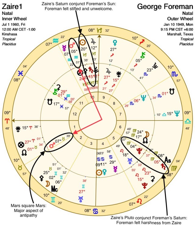 - Zaire1 Mars square Foreman Mars: Dysfunctional Mars contacts are notoriously confrontational and violent. The hostile nature inferred in contact # 2 is echoed here in a more direct fashion. These two contacts were probably the reason why Zaire didn’t have any dissonance chanting, “Ali, kill him!”
