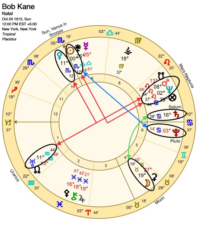 Holistically, this fits fairly well, but as stated in previous articles, t-squares are engines of energy, motivated into action by some type of discomfort (or suffering). With this understanding and some knowledge about Batman’s biography, there may exist a unique possibility in reconciling Kane’s birth time. For example, if Kane were born just a bit earlier (sometime prior to 8 am), then he would have a Libra Sun, which would contradict some of the Scorpio expression we have observed in Batman. This infers an exclusion of birth times prior to the early morning.