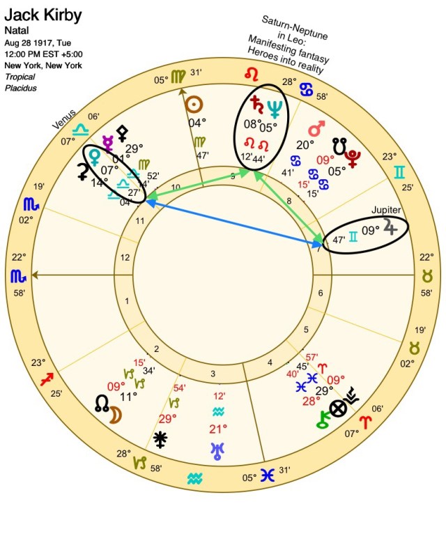 What makes this conjunction particularly powerful is that it sits at the midpoint of Kirby’s Venus-Jupiter trine, sextiling each side. In astrology, this is known as a talent triangle and offered Kirby the ease of ability and inspiration to artistically express (Venus) a grand vision (Jupiter) of other realities and mythological dramas (Saturn-Neptune). With this conjunction in the sign of Leo, Kirby expressed all of this through the format of heroes.