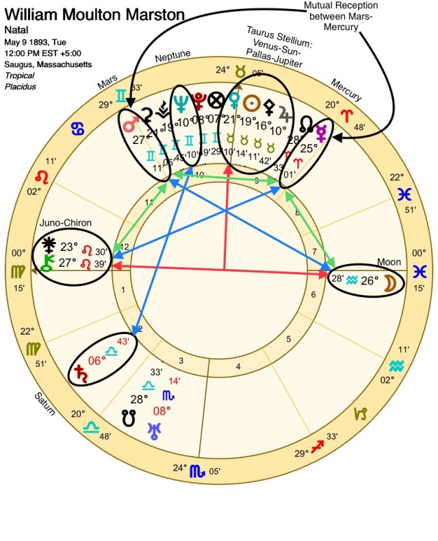 Wonder Woman is the last DC superhero to analyze. William Marston’s chart is fairly straightforward and matches the character (and his unique bio) well.
