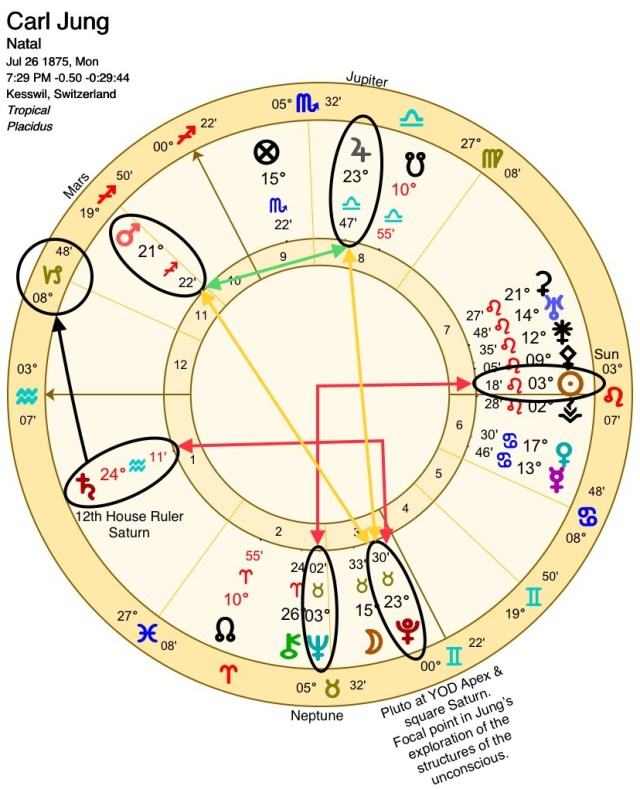 With Jung, this dynamic was amplified by his 1st house Saturn in square aspect to his 3rd house Pluto. Saturn rules Jung’s 12th house[6] which represents places associated with other states of consciousness or mystical or spiritual experiences. Placed in Jung’s 1st house, he was concerned with how the structure (Saturn) of the unconscious (12th house) impacts the self (1st house) and how that structure could be transformed (Pluto).