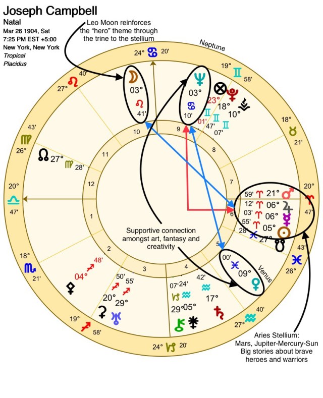 Campbell’s Sun-Neptune square differs from Jung in that it includes the presence of Mercury and Jupiter. Like Jung, Campbell felt the pull of the mystical, but instead focused on how these connections manifested in the epic (Jupiter) stories (Mercury) of conflict (square aspect, Aries sign) in the hero’s (Sun) mythological journey (9th house Neptune)[7]. It is interesting that Jung’s manifestation of the Sun centered on the ego while Campbell’s focused on the hero. Both are legitimate representations of the Sun archetype brought into prominence due to their relationship with Neptune.