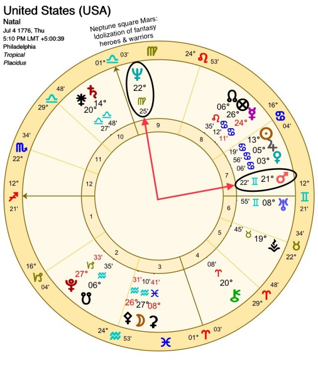Neptunian dynamics are also highlighted in the inception chart for the United States where Neptune is receiving a tight square aspect from Mars (below).