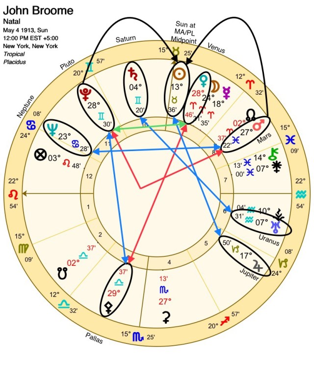 The Sun is conjunct the midpoint of Venus and Pallas, a picture of a female hero who is a warrior goddess. This warrior theme is further strengthened by the mutual reception sextile between Mercury and Mars that are aspecting almost every component of this configuration.