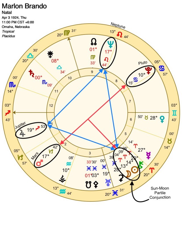 [3] It shouldn’t be ignored that both Mars and Pluto are co-rulers (traditional and modern) of Brando’s 12th house of “behind the scenes activities”. Also, the 8th house is also known as the house of death.