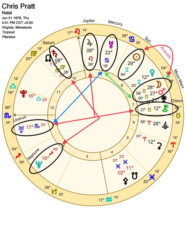 Mercury is the ruler of Pratt’s 11th house of friends and associates and positioned within the 9th house of foreigners. Its placement within the sign of Cancer shows how these individuals are like a family and the trine to Uranus confirms that they support his rebellious nature.[4] Overall, these dynamics well support the manifestation of his team, the Guardians of the Galaxy, assembled from different areas of the galaxy and operating like a irreverent, yet close-knit family.