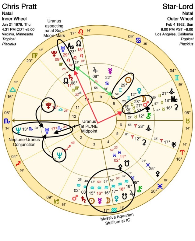 This bi-wheel contains Pratt’s chart in the center with the positions of the planets for Star-Lird’s elected date of birth in the outer wheel. The most immediately noticeable connection is Star-Lord’s Aquarian stellium tightly aligned to the cusp of Pratt’s 4th house. At a high level, the 4th house represents early family environment and this also extends to ancestors and lineage.