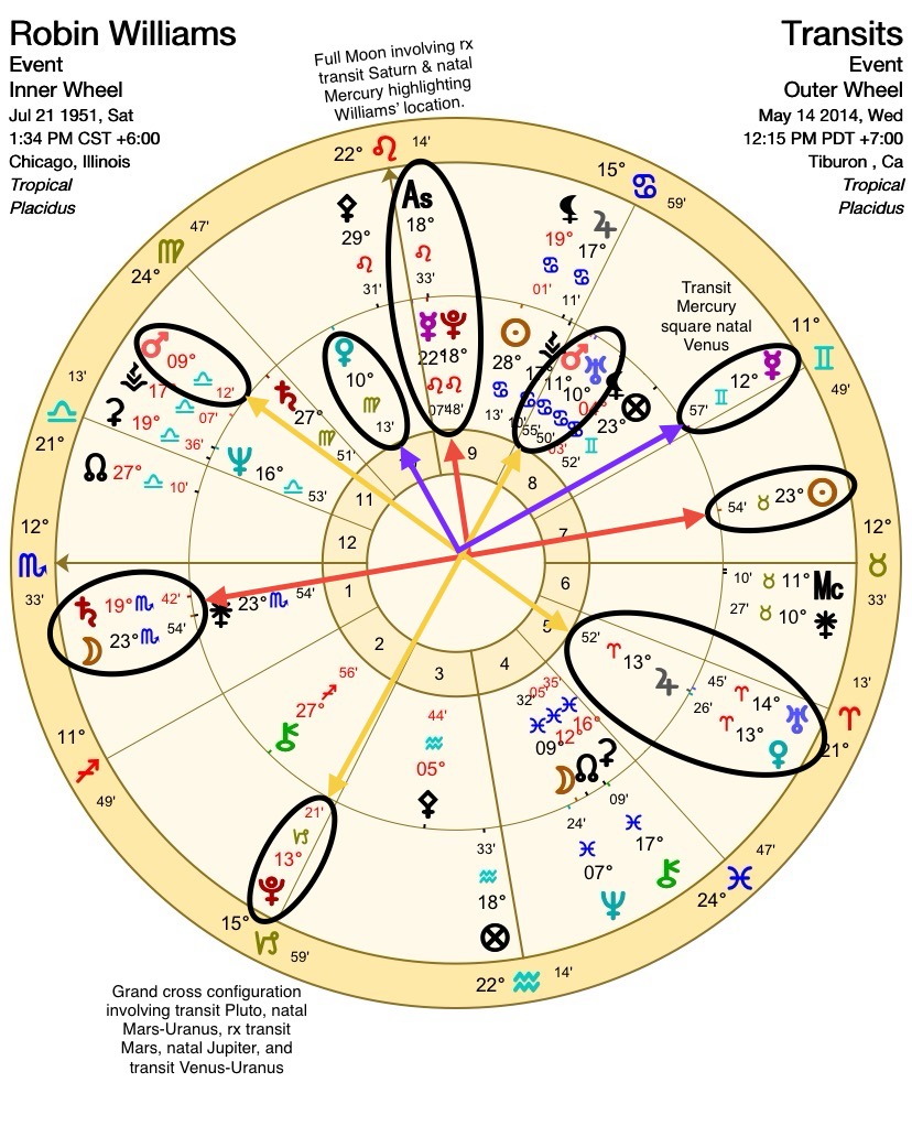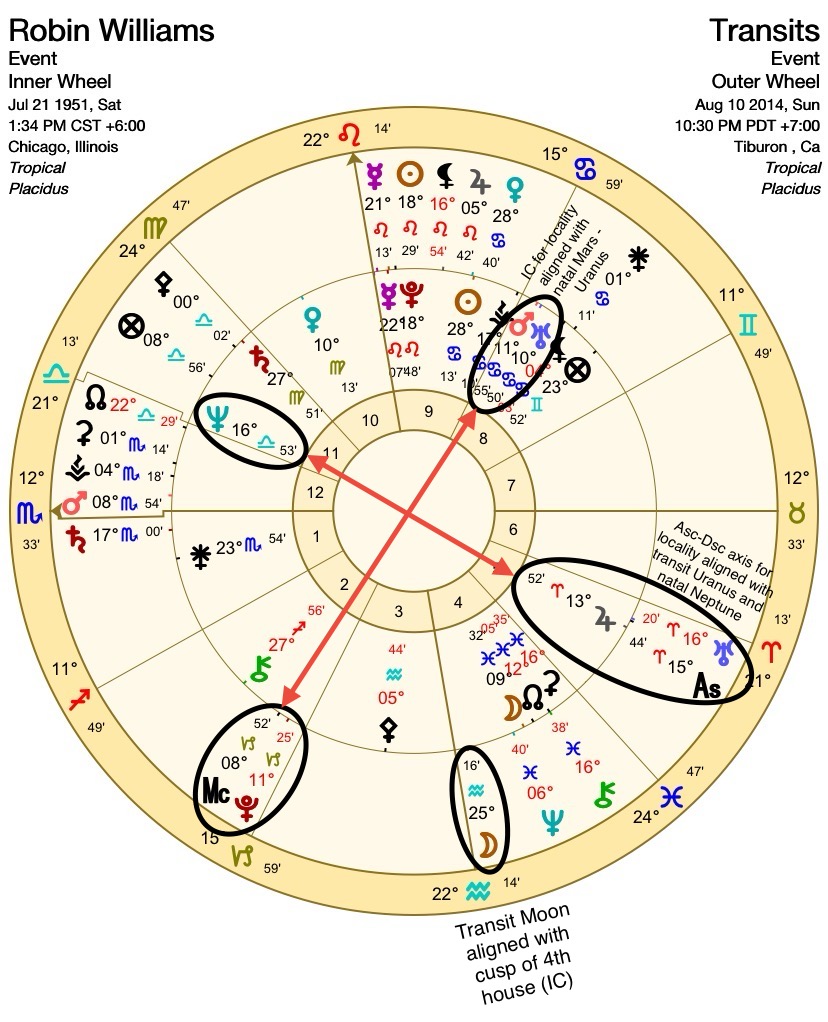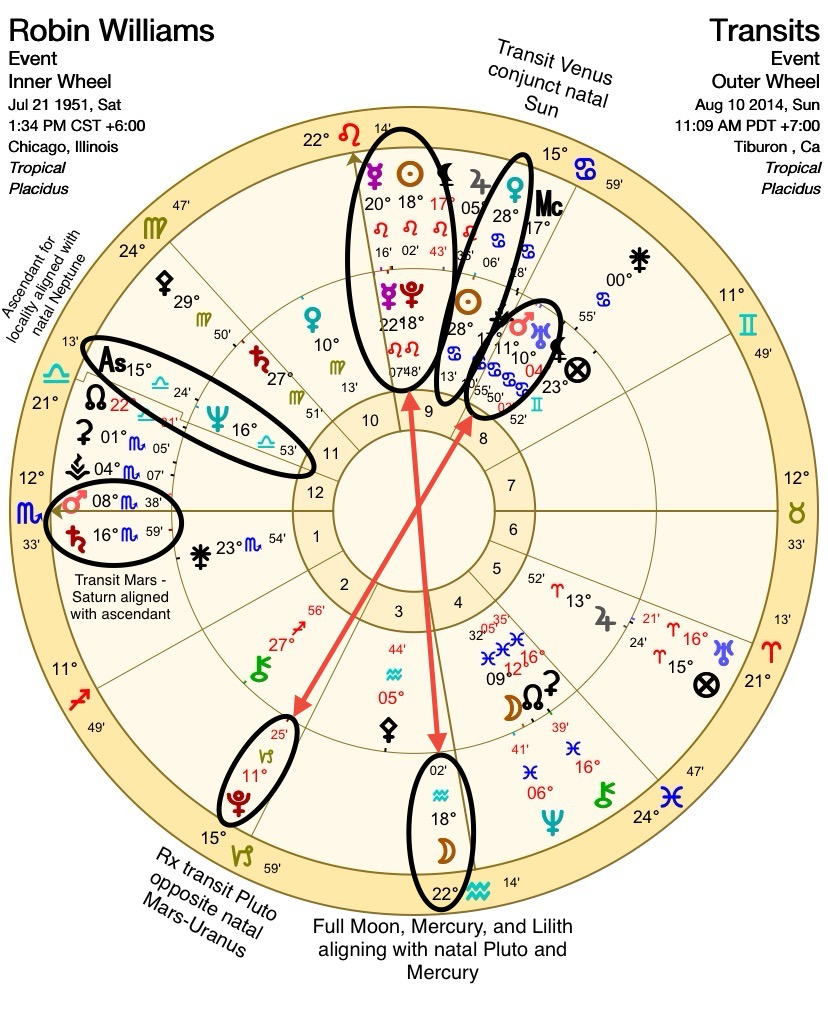 On August 11, 2014 we learned the horrible news that Robin Williams had taken his own life. The surreal juxtaposition of a comedian and artist with an almost boundless supply of wild, creative energy with that of a severely depressed, suffering and manic individual are almost impossible to reconcile, but these layers can exist within an individual. It has been almost seven years since this tragedy and I hope we are at a point where this event can be analyzed because there is some valuable insight to be gleaned from reviewing the involved astrological transits. As a result, this analysis[1] leans heavily on the details and timeline of events provided by Dave Itzkoff in his Vanity Fair article that can be accessed here.