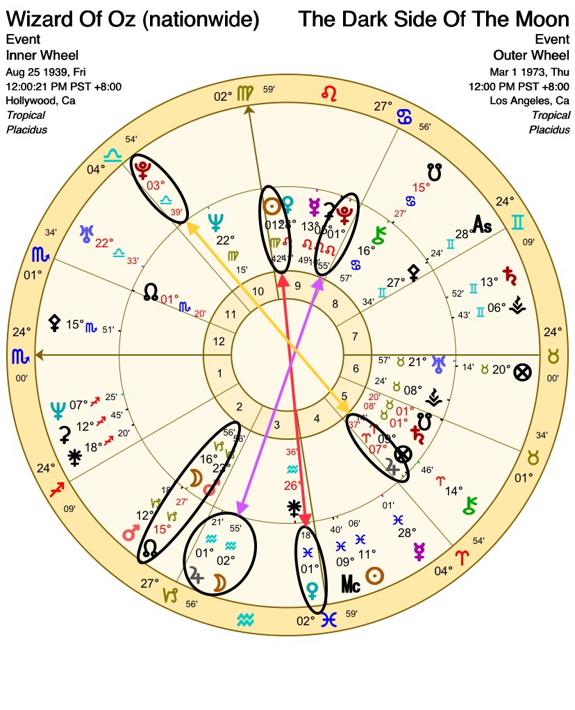 - DSOTM Pluto opposition WOO Jupiter (yellow line): This is the third opposition and significant because it reinforces the Jupiter-Pluto opposition seen in the 2nd dynamic above. Overall, these specific aspects show how the combination of these two works of art intensify and expand their influence through their reflection upon each other.