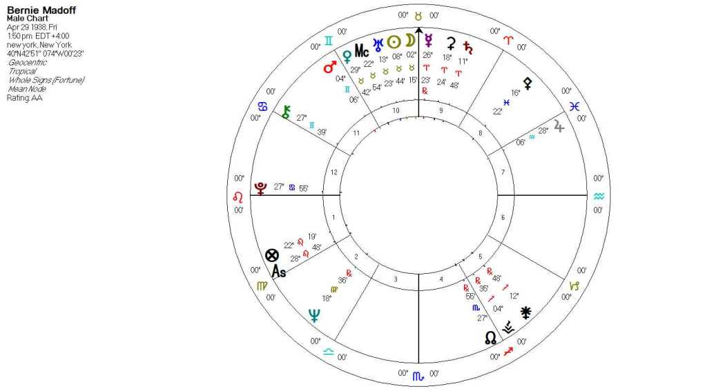 The recent documentary series on Netflix detailing Bernie Madoff’s massive $65 billion Ponzi scheme has sparked a renewed interest in this particular scenario, one of the largest instances of fraud in history. While there is much to learn from this horrible example, Madoff’s astrological dynamics also offer some interesting insights not only into his inner workings, but also how his life manifested.