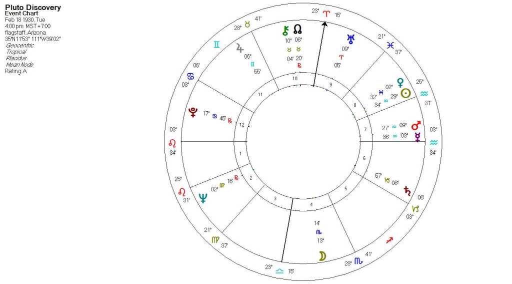 “First” moments are huge in astrology. Our individual birth charts are constructed based upon the first breath of independent existence. With a marriage, the wedding chart is thought to become active when an authorized third entity formally recognizes two individuals’ intention to join together in a committed relationship. And for countries, these charts are usually constructed around the signing of a constitution. An astrological chart seems to “begin” upon the conscious intention or awareness of that entity’s existence (although, that moment of intention or awareness is sometimes of endless debate). For the planet Pluto, there actually exists a documented moment when this planet was discovered and confirmed to exist. As a result, we have a chart for its discovery. Since all charts contain the inherent characteristics of its entity, it is logical that the chart for the discovery of Pluto should contain the basic essence of this planet.