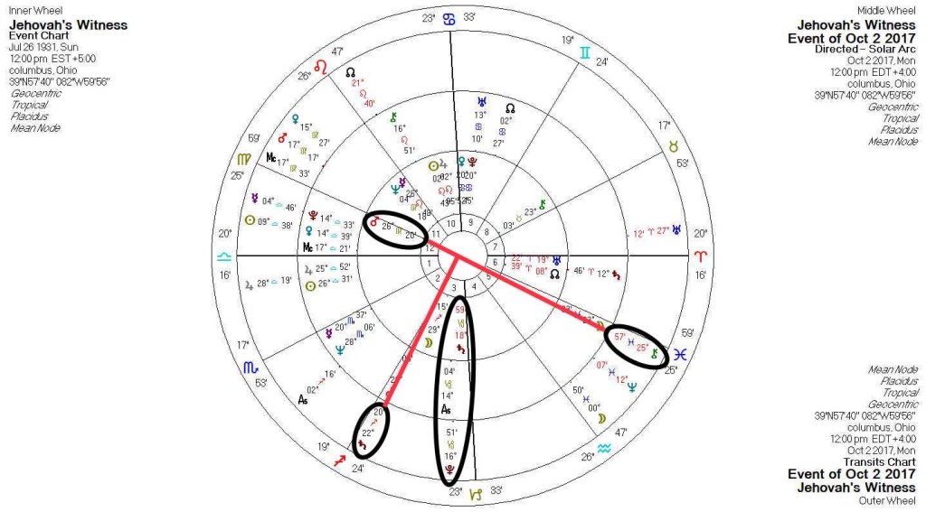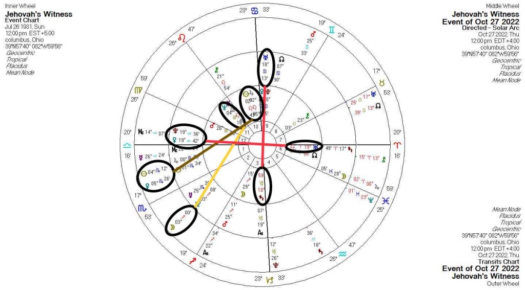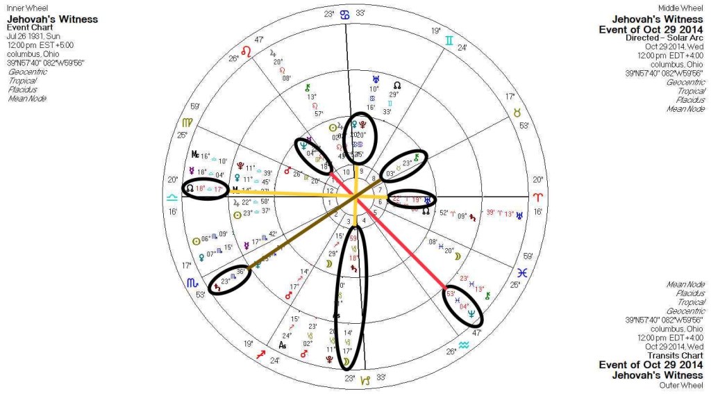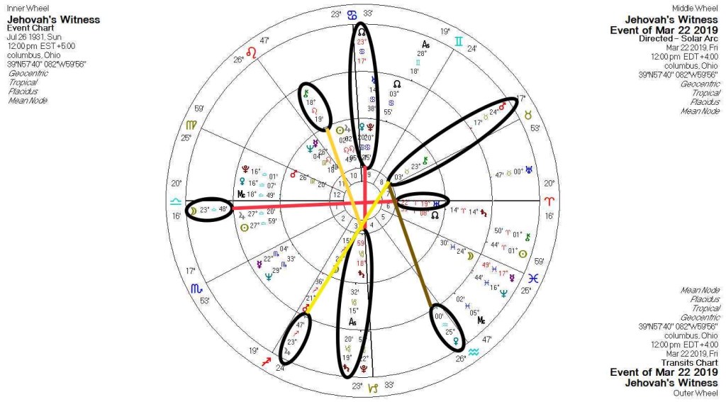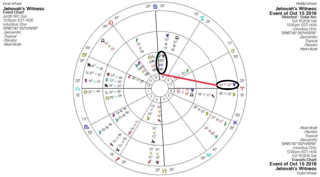 If there is one clear trend with the astrological correlations to the manifestation of events it is the high volume of contacts to the organization’s Uranus T-square. In almost every event above, there was a major contact by transit or solar arc to this defining configuration. It should be noted many of these contacts or aspects are very rare and only occur once-in-a-generation. For example, the full chart solar arc square currently in effect only occurs at 90-year intervals. Most human beings do not even live long enough to experience this “end of life” milestone. With solar arcs representing a “higher octave” of manifestation than transits and the square representing confrontation and conflict, what Jehovah’s Witness is experiencing is an existential and archetypal manifestation of Armageddon symbolized by the T-square activating itself. The fact that it has been building for 90 years offers some indication as to the impact of the karmic potential that is being unleashed. This has been a long time coming.