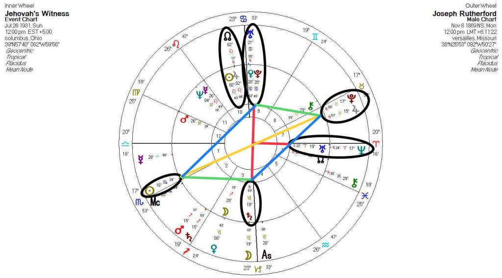 From an astrological perspective, Rutherford’s most significant action was renaming the organization to “Jehovah’s Witness” in 1931. Because the historical record maintains an exact date for this name change, there is an astrological chart to analyze and compare. The bi-wheel (organization – inner wheel, Rutherford – outer wheel) below shows an overwhelming number of connections between the organization and this man who shaped it into what it would become.