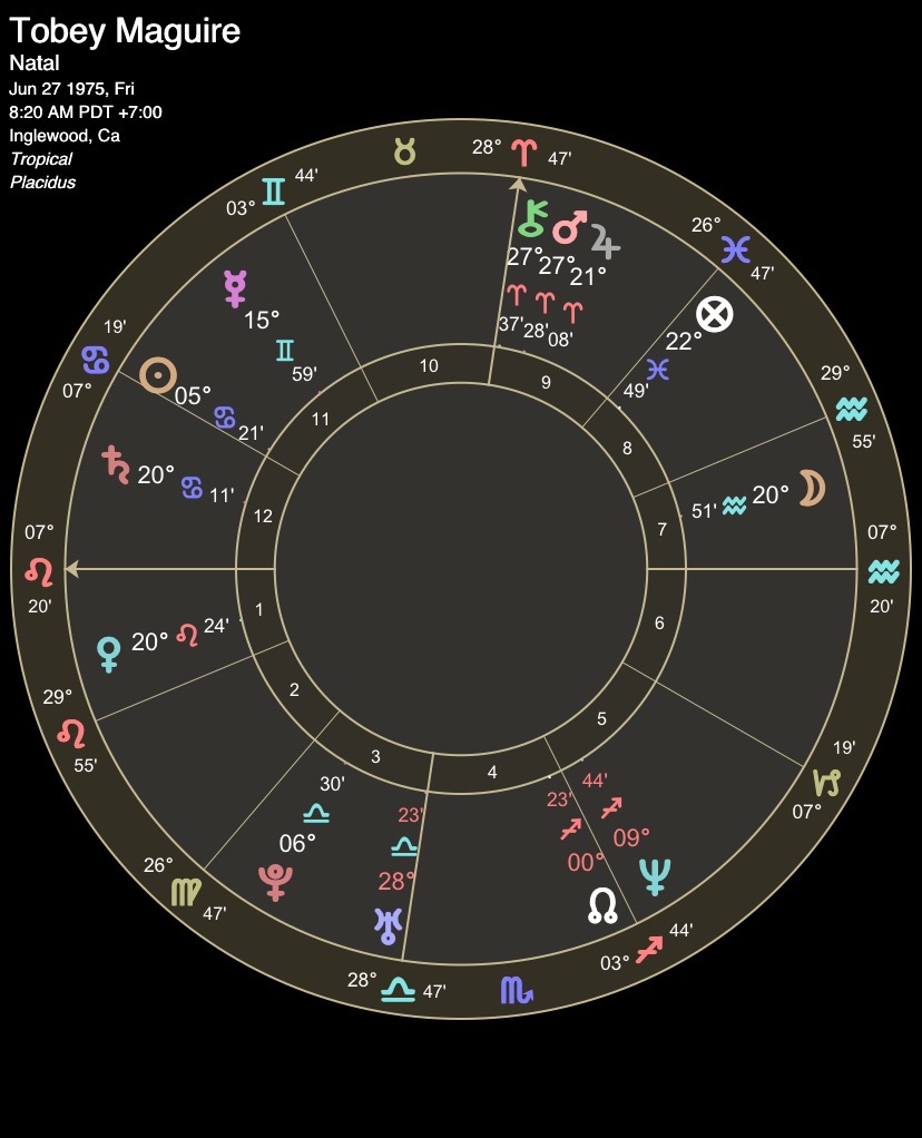 There have been many Spider-Man movies over the years and different actors to portray this super hero. Tobey Maguire was the first actor to portray this character in a major motion picture. Because he is the original, he is often viewed as the first true Spider-Man by fans.[i] As a result, his natal chart may offer some interesting correlations to the character. Let us look at some of the major dynamics.