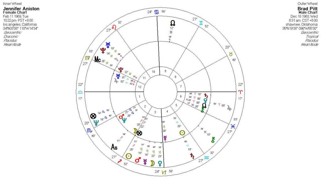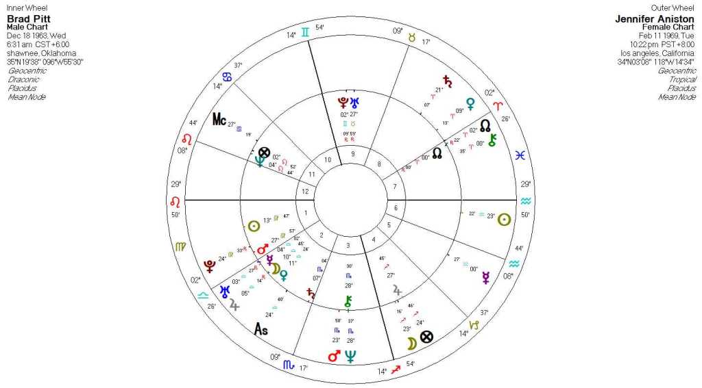 Jennifer’s draconic chart shows a strong degree of affection and love for Brad. Her draconic Moon is conjunct his tropical Sun, one of the top indicators of synastry in a relationship and this significance is heightened because the draconic chart is a chart of the Moon. Who Brad is, his core energies, and sense of self was something Jennifer had fully embraced and integrated into what she felt. This connection alone is strong enough to provide the rationale for their romance.