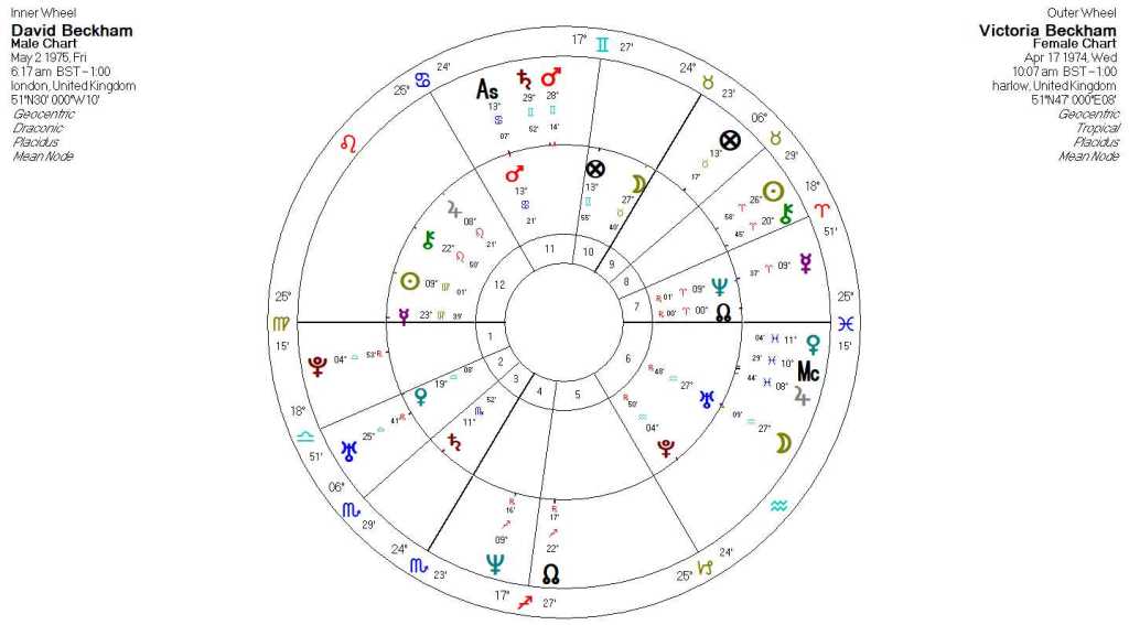 David’s draconic Mars in Cancer rules his 8th house and is in tight conjunction with Victoria’s tropical Ascendant. This reflects his physical attraction to Victoria, but it also shows that he is fiercely protective of her as well. This is also a reflection of love and romance because his draconic Mars is in trine aspect to Victoria’s tropical Venus. This is reinforced by the fact that these same two planets are in aspect to each other in Victoria’s draconic a chart as well. In that chart, Victoria’s draconic Venus (her 8th house ruler) is conjunct David’s tropical Venus and square David’s tropical Mars (which also includes her draconic Neptune). Mars and Venus are the male female archetypes. David and Victoria are the male and female in the relationship. Quite literally, they are combining their archetypal roles in an alignment that could be seen as an example of sympathetic magic. And this magic produces more than just sexuality. This feels like love. And if there were any doubts about how gaga David is about Victoria, his draconic Sun in opposition to her tropical Venus as well as his draconic Venus in opposition to her tropical Sun puts all that to rest. He thinks she is the most gorgeous thing he has ever seen.