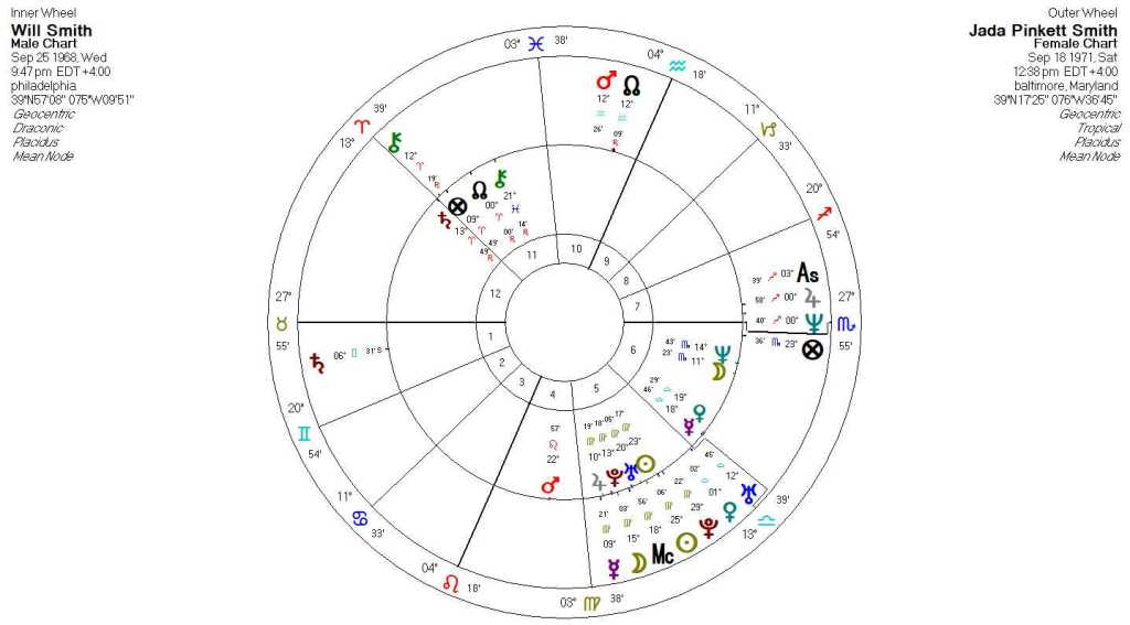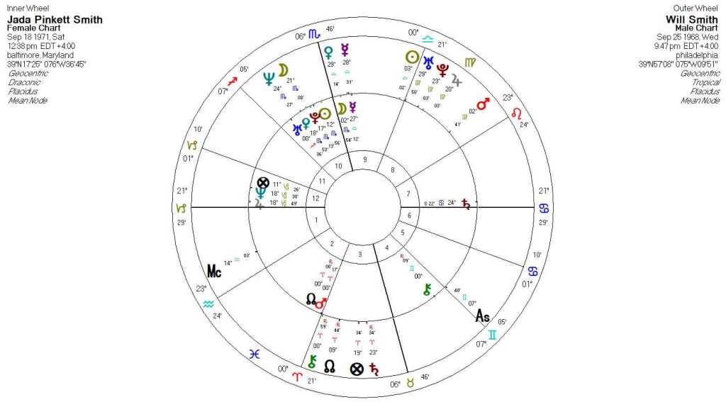 The conjunctions across draconic to tropical charts tend to create a sense of familiarity or comfort in the draconic person in response to the energies expressed by the tropical person. Feeling “at home” with another can be a major source of attraction as well as a solid foundation for synastry. A powerful example of this is Will’s draconic stellium aligning with Jada’s tropical Virgo stellium, which includes a tight conjunction between his draconic Sun and her tropical Sun. The Virgo quality that Jada epitomizes is what Will needs deep down. The caution is that this overwhelming amount of Virgo energy can seek a level of perfection that can become unhealthy. When we consider the square from Jada’s tropical Saturn it starts become clear that this is not just conjecture. Its placement in Will’s 1st house is restrictive, enforces a level of control that probably feels, from Will’s perspective, like he cannot breathe. If we flip to Jada’s draconic chart, we see some of these themes echoed. Jada’s draconic Saturn is the chart ruler and tightly conjunct the cusp of the 7th house and square Will’s tropical Saturn, Mercury, and Venus. This means his energies are at the center of her needs to exert a certain control over her romantic relationships. This t-square configuration probably ground zero for many conflicts between them.