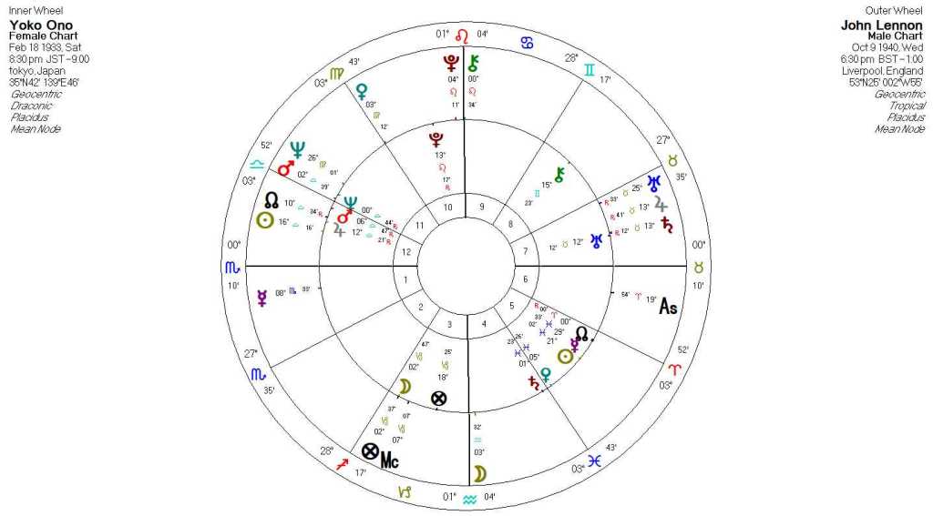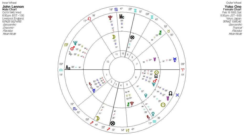 This relationship contained a characteristic that is like what was found with Beyoncé and Jay-Z. Here, the chart structure of John’s draconic chart aligns with the chart structure of Yoko’s tropical chart. This means that John understood Yoko very well and identified through her expression and identity.