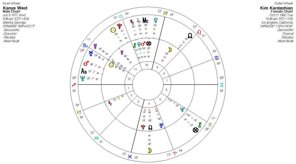 Kim’s draconic Venus in conjunction with Kanye’s tropical Venus – Mars – Chiron is a major contact. It is the instant attraction between the two. Kim is naturally a hopeless romantic with her Venus – Neptune square and Kanye offers that romance to her. This alignment also hints at potential problems due to the involvement of Kanye’s Chiron in Taurus. Kim’s love may be a way to help heal his insecure sense of self-worth. On Kayne’s draconic chart, his Pluto is aligned with Kim’s tropical Venus – Neptune. Pluto – Venus contacts can become a bit obsessive in relationships so Kanye feels very intense about Kim. This contact is evidence of Kanye’s strong attraction to Kim, but also hints at a desperate need to maintain power over her. This theme of power and controlled are reinforced by Kanye’s draconic Saturn in square aspect to Kim’s tropical Sun – Pluto. This contact brings an unusual amount of heaviness to the relationship and can make everyday living almost impossible to bear.
