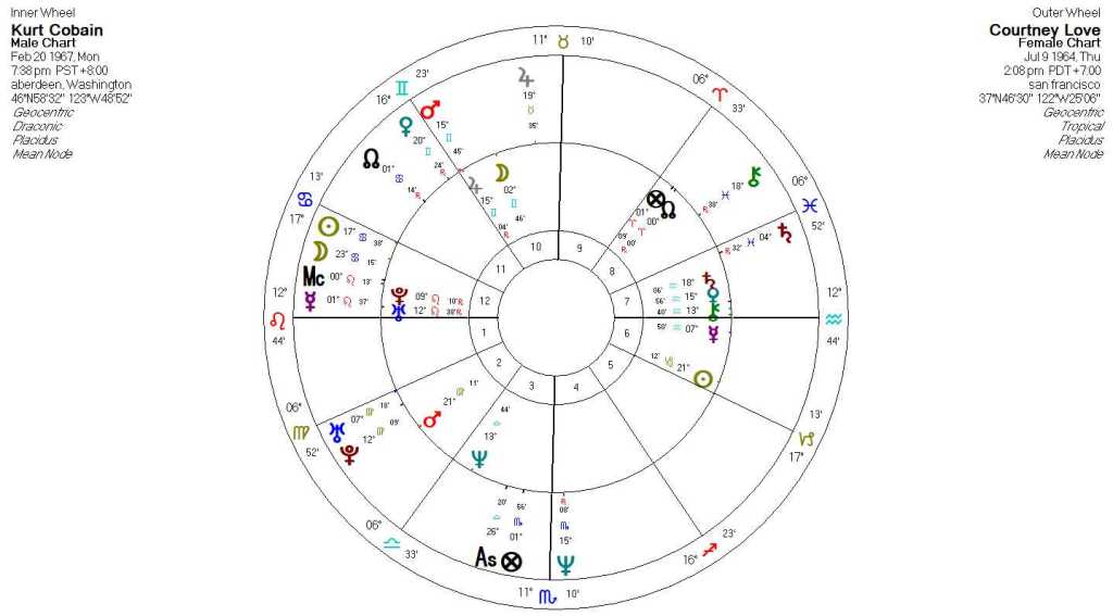 Additionally, Courtney’s draconic Sun – Moon in Aries is square Kurt’s tropical Moon – Jupiter in Cancer. According to their biography, Courtney was a little aggressive in trying to meet Kurt and with these alignments one must wonder if that aggressiveness played out in the rest of their relationship. There is no doubt that she was attracted to him and his rock star persona. This was represented by her 8th house draconic Venus in opposition to his tropical Pluto – Uranus – Ascendant, but the rest of the dynamics paints a more detailed picture into the inner workings of their relationship and compels some uncomfortable questions. Did she control most of his actions? Was she constantly pushing and driving him? Did she exacerbate his wounds of feeling different and weird with drugs (Kurt’s draconic Chiron – Venus in Aquarius)? Does she have any responsibility for the outcome? We will probably never know and it is possible that Courtney has asked these questions to herself as well. For as much as her draconic Venus opposite Kurt’s tropical Pluto – Uranus – Ascendant reflected an intense attraction to his persona it also left her with confronting why he took it upon himself suddenly destroy who he was. And with her draconic Mercury ruling Kurt’s Ascendant and opposing his tropical Mars that is placed on the cusp of her 4th house (end of the matter), the questions of his ultimate demise will torture her the rest of her life.