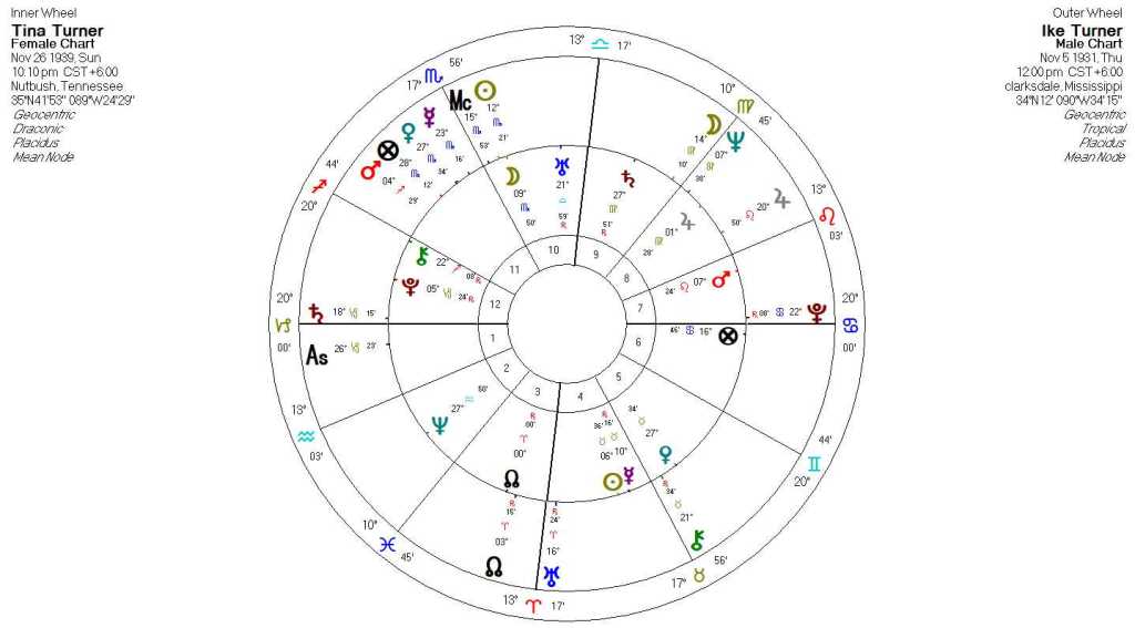 Because Ike does not have a public time of birth, we will have to default to Tina’s draconic chart for some insights into the relationship. The most visible problem is Ike’s Saturn – Pluto opposition aligned with Tina’s draconic Ascendant – Descendant axis. Hard aspects between Saturn – Pluto have a reputation for being tortuously harsh and ruthless. Sometimes even sadistic. Ike had these potentials in him and he unleashed them on Tina in a manner that hurt her in the deepest way possible. With Ike’s tropical Uranus in square aspect to this polarity and in opposition to Tina’s draconic Uranus, this grand cross of energy became the chaotic relationship (Uranus in Libra) within her. But because her Uranus is also in her 10th house, this abuse was eventually going to be brought to the light of day when she told the rest of the world about what he did to her.